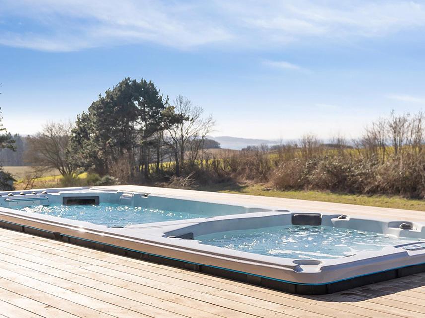 En swimspa er et kombineret spabad og swimmingpool med varmt vand hele året rundt. Denne kunde har nu wellness og svømmetræning ude i den fri natur sommer og vinter.