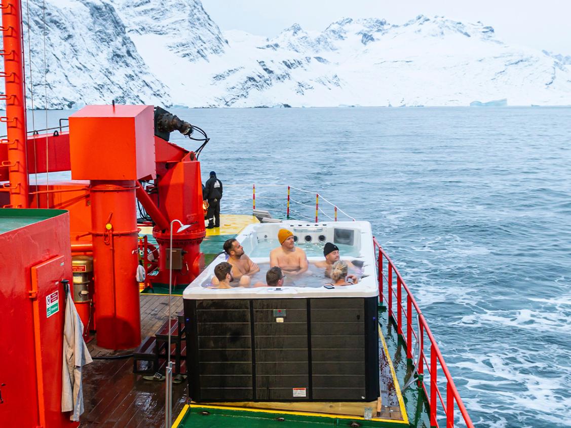 Se eksempelvis billedet herunder af fem ansatte på det arktiske explorer-skib, som nyder en tur i deres boblebad fra DenForm på Grønlandshavet.