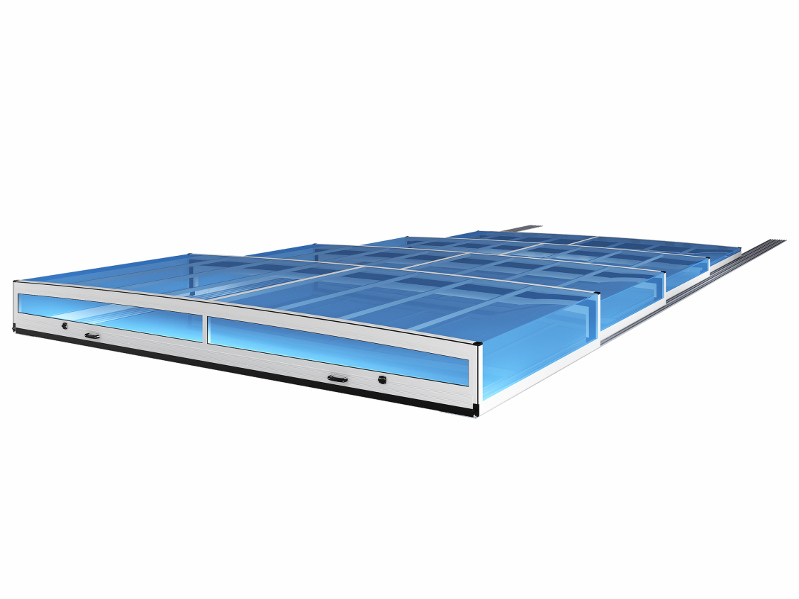 Pooltag Alva er altid med klar plast, 4 mm polycarbonatplast. Dertil er der ekstra flade komfortskinner med en højde på kun 12 mm. Derudover har pool overdækningen automatisk sektionslåsning med nøgle, så det kan åbnes og lukkes hurtigt og nemt.