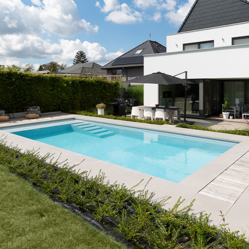 Oplev ultimativ afslapning og luksus med vores La Plage 9-pool. Denne rektangulære pool med dimensioner på 900x400x150 cm tilbyder rigelig plads til at svømme og nyde solen. Med en indbygget trappe i det ene hjørne er adgangen til vandet nem og bekvem.