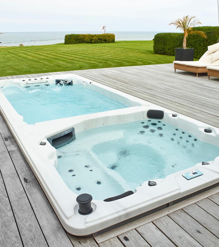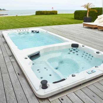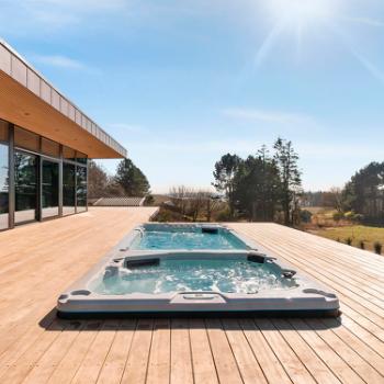 En swimspa kombinerer den ”klassiske” udespa med en swimmingpool, og kan enten bygges som ét stort spabad/swimmingpool med samme styringssystem eller som en todelt løsning – én side med spa og én side med pool. Den todelte løsning har to separate styresystemer, og det er derfor muligt at holde to forskellige vandtemperaturer samtidigt. Vi har 6 forskellige swimspa, hvor to af modellerne er todelt.