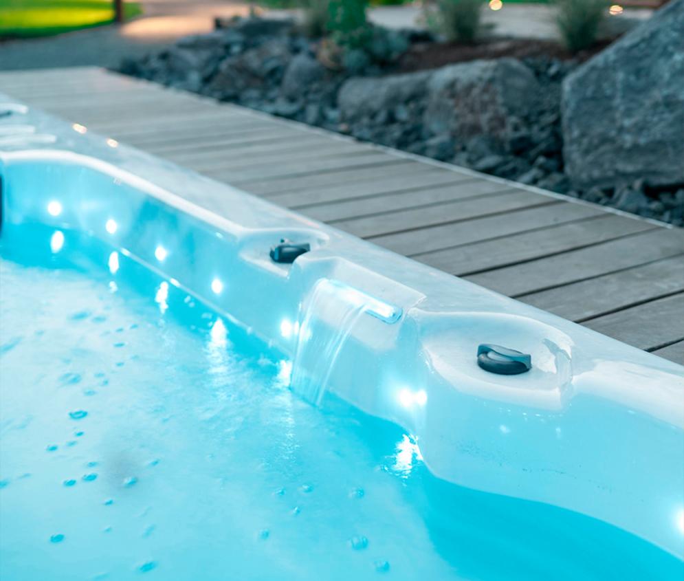 Et af hovedelementerne i en swimspa er den kraftige svømmetræner, som er installeret i enden af swimspaen. Modstrømmen leveres af 3-5 jetstråler som er tilkoblet 3 kraftige massagepumper (oftest på mellem 2,5 og 3hk) – i alt 7,5 – 9,0hk. Det er kraft nok til at elitesvømmere kan træne i swimspaen. Vi har leveret DenForm® swimspa til flere professionelle sportsudøvere, som du kan læse mere om her på siden.